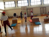 体育の時間、跳び箱運動でかかえこみ跳びにチャレンジしていました。両手を跳び箱につき、その間を足を抜いて着地します。