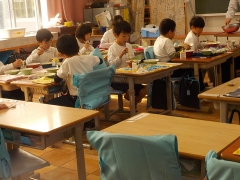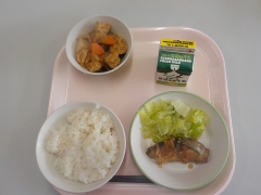 今日の給食は、米飯、牛乳、あじのピリ辛だれ、即席漬、関東煮でした。