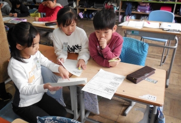 かけ算の学習もいよいよまとめの段階に入ってきました。今まで習った九九を総合的に活用して、問題を解く学習です。ワークシートに書かれた24個の「点」を、2つや3つずつにくくり、それがいくつあるかを求める学習です。いろいろな式の立て方が考えられます。友だちの考えを聞きながら、さらに考えを深めることができました。