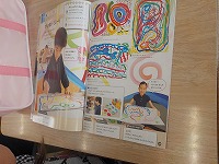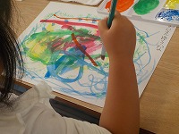 図工の時間、絵の具を使って「すいすいぐるーり」と線や円を描きました。子どもたちは慎重に色を混ぜて楽しそうに筆を走らせていました。