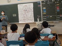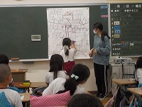 今日は雨で出かけることができませんでしたが、先日校区探検にいって見つけたものを発表し地図に書き込んでいました。学習した地図記号を入れたり、友達の家を表したり、たくさんの発見が見られました。これからも地区のいいところやみんなに知らせたいところをたくさん見つけてきてください。