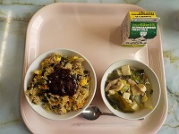 今日の給食は、かみかみビビンバ、牛乳、豆腐とわかめのスープでした。