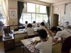 6年生が家庭科室でミシンを使っていました。久しぶりの糸と針に「玉留め、どうやるんやったっけ。」と友だちに聞いたり、ミシンの糸掛けの仕方を相談したり、ミシンで縫う場所を確認したりしながら、自分用のランチョマットを一生懸命作っていました。感染症予防のため、ミシンの配置は例年と違って同じ方向を向いて配置してあります。