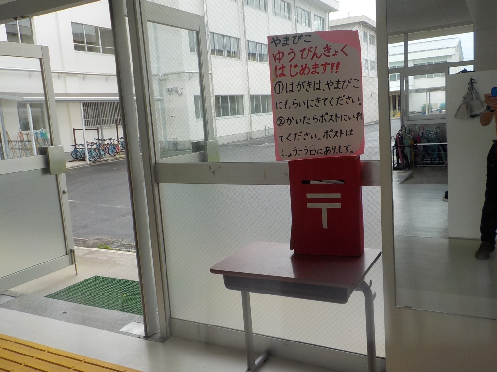 やまびこ学級が暑中はがきを出すこの時期に取り組んでいる「やまびこゆうびん」が始まりました。昇降口に設置したポストには、たくさんのハガキが入っていました。やまびこ学級で仕分け、配達などをして届けられます。