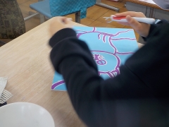 版画の作品を作っています。彫刻刀を使い、子どもたちが描いた絵が引き立つように工夫しています。
