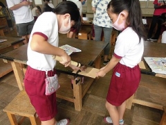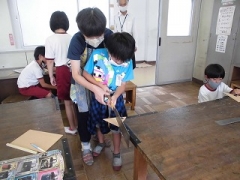 4年生が図工の時間にのこぎりを使って木切れを切り、作品を作っていました。