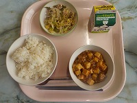 今日の給食は、米飯、牛乳、麻婆豆腐、かみかみナムルでした。