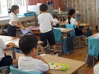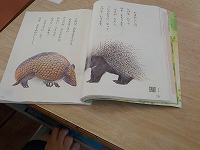 国語の時間、動物の身の守り方について学習しています。ヤマアラシの身の守り方について読んだことを二人組で確かめて発表していました。
