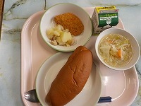 今日の給食は、黒糖パン、牛乳、カツオフライ、リオネーズポテト、野菜スープでした。