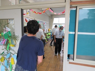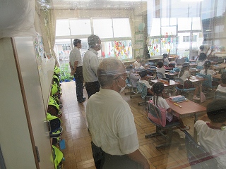 まず校内を回っていただいて、子どもたちの学習の様子などを参観いただきました。その後、子どもたちの実態や本校を取り巻く環境などについて協議を行いました。コロナ感染対策や熱中症対策についてのお話の中で、学校再開となり、「登下校の様子が楽しそう」「当たり前のことのありがたさを感じた」「改めて『学校っていいな』と思ってもらえたのではないか」等のご意見をいただきました。また、「子どもたちに(コロナ感染対策の間の記憶が)マイナスの記憶にならないようにするのは大人の仕事だ」「長期期間の休み中の家庭での過ごし方を考える必要もある」とのご指摘もいただきました。