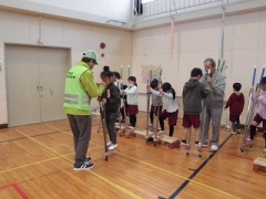 今日は常磐地区社会福祉協議会の方に来ていただき、1年生の子どもたちに昔の遊びを教えていただきました。竹馬・あやとり・おはじき・コマ回し・紙ひこうきのコーナーに分かれて遊びを楽しみました。幼稚園でやったことがあると上手にコマ回しをする子もいたり、初めて竹馬に乗った子もいたりしました。