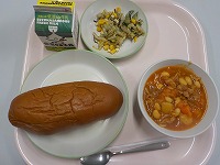ポークビーンズは、ジャガイモやトマトが、骨コツサラダには、キャベツ、コーン、キュウリが入り栄養たっぷりの給食でした。