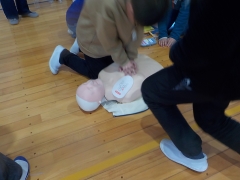 午後から学校保健委員会を開催しました。5限目は、5年生の心肺蘇生法について学習し、実行委員の子どもたちが司会を務め、ペットボトルや心肺蘇生用の人形を使って心肺蘇生法の実践をしました。心臓マッサージはやり続けることが大切なので、命をつなぐためには、周囲の人も巻き込んでいくことが必要です。6限目は、保護者の方に子どもたちのグループに入ってもらって命をつなぐこと、病気の予防について協議しました。