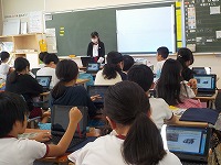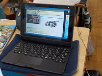 社会科の時間、自動車工業について学習したことをタブレットでまとめて発表しました。身体に障害のある方のための自動車や電気自動車など自動車工場で工夫されていることについてまとめ、発表しました。