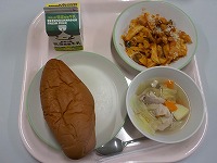 今日の給食は、黒糖パン、牛乳、トマトグラタン、野菜スープでした。トマトグラタンは、子どもたちに人気でどのクラスもお代わりの列ができていました。