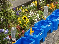 保健室前の花壇にきれいに色とりどりのパンジーがきれいに咲いています。