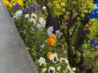 新緑が深まるとともに花壇のパンジーが鮮やかに見えます。