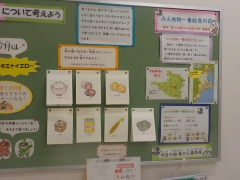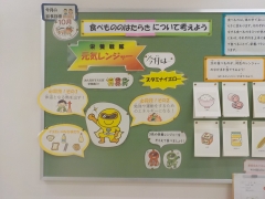 10月の給食目標は「食べ物の働きについて考えよう~黄のなかま~」です。昇降口に掲示がされていました。「スタミナイエロー」という正義の味方で掲示してもらっています。食物に含まれる黄色は、「熱や力になるもの」です。黄色の食物を食べて、力をつけて10月末の運動会ではパワー全開で最高の演技をしてくれることを期待しています。