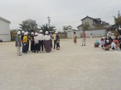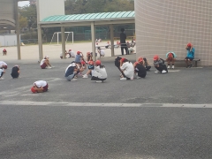 20分休み子どもたちが遊んでいる最中に緊急地震速報の放送が流れました。外にいる子、教室にいる子、立ち止まり頭を守っています。揺れが収まり運動場に避難しましたが、逃げ遅れの子とけが人がいたので、先生たちが救助に向かいました。