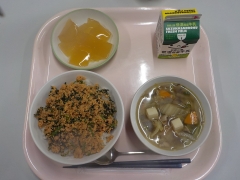 今日の給食は、さけ丼、牛乳、けんちん汁、手作りリンゴゼリーでした。今日のゼリーは給食室での手作りです。