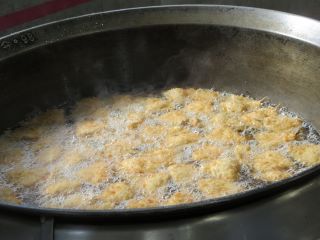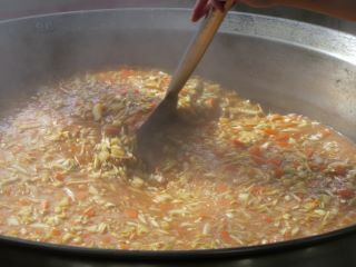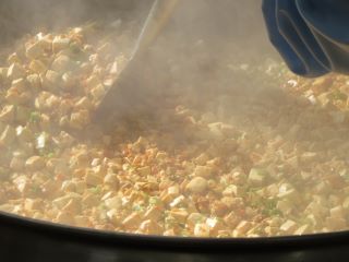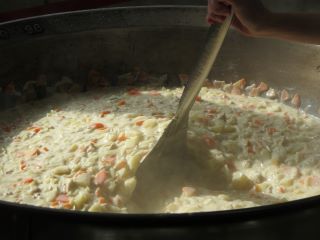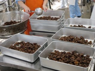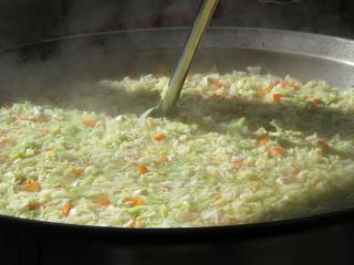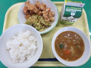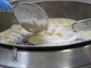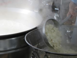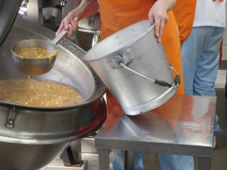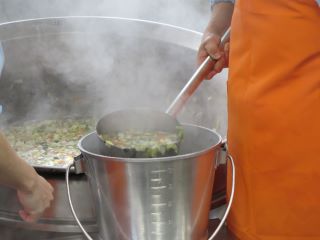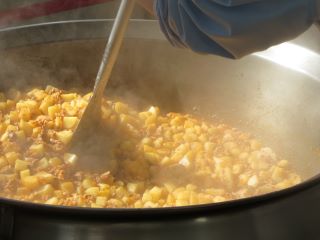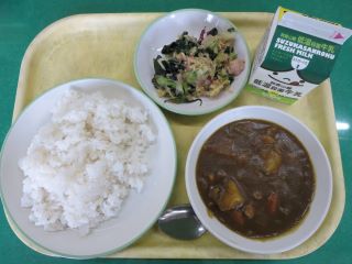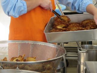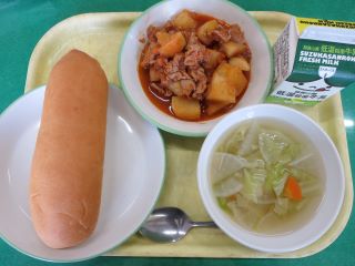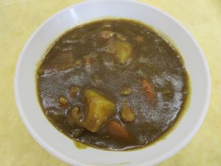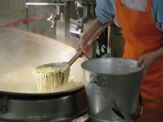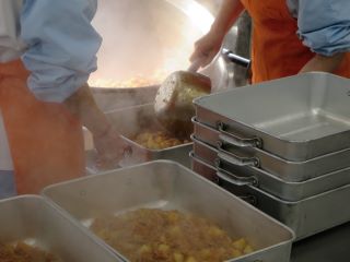 給食のカレーは大きな釜でたまねぎをじっくり炒めて、かくし味にすりおろしたりんごを入れてじっくり煮込んで作ります。