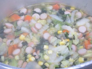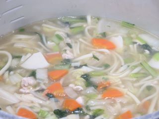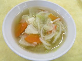 にんじん、大根、キャベツ、豆腐、魚めんの入ったスープです。