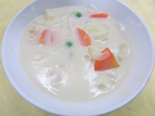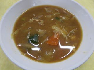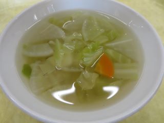 大根、にんじん、キャベツ、コーンが入った野菜スープです。大根は三重県産です。
