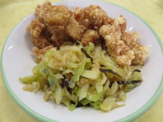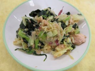 ツナ、キャベツ、小松菜、海藻をドレッシングで和えました。