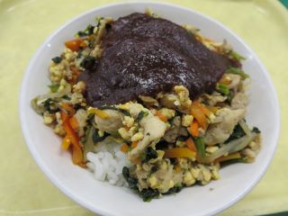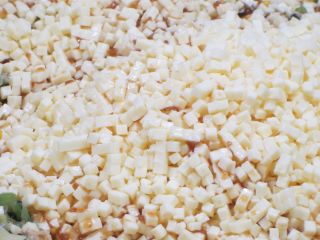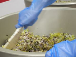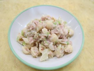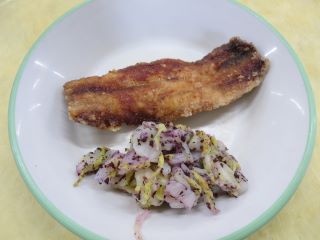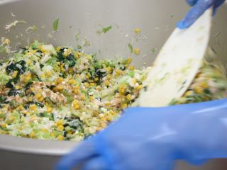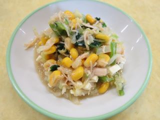 チーズ、ささみ、コーン、小松菜、キャベツをドレッシングで和えました。
