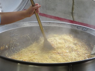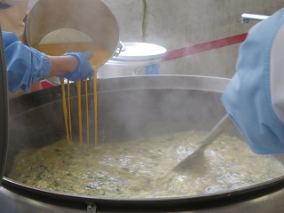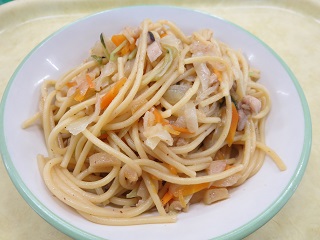 和風スパゲッティは粉かつおを入れて、みりん、しょうゆで味付けをしました。