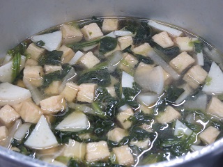 大根、ほうれん草、かまぼこ、厚揚げが入ったすまし汁です。