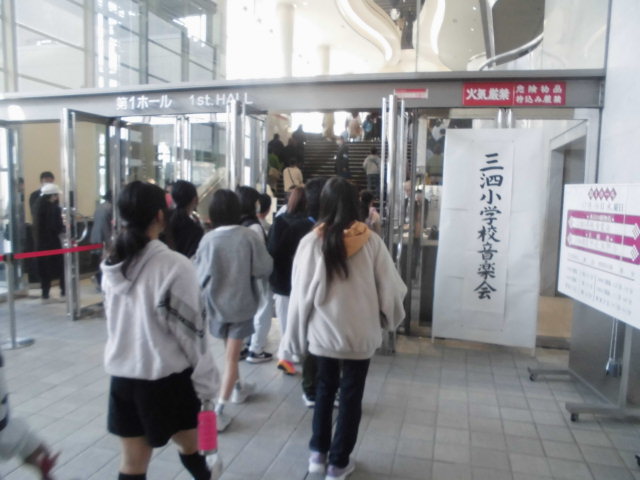 今日は、三泗小学校音楽会本番でした。出発前に児童代表が「がんばろー」「おー」と昔っぽい掛け声をかけ、元気に出発しました。今年は以前のように保護者の方にも観覧いただけるようになって、多くの学校の保護者の方にも参観いただいたようです。