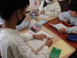 今日は6年生と4‐1で「ぐるぐる 読書DE発見ツアー~はやみねかおる作品を読んでみよう!~という授業を行いました。
