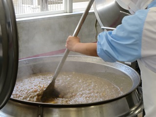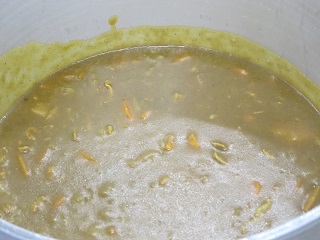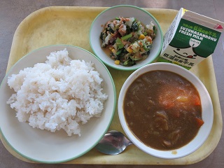 今日のカレーは、豚肉、玉ねぎ、にんじん、じゃがいも、りんごを入れてじっくり煮込んで作ります。