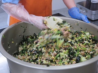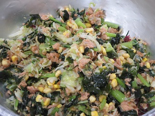 海藻サラダは、海藻、キャベツ、小松菜、ツナ、コーンをドレッシングで和えました。