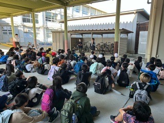 常磐小学校に到着し、ピロティで到着式を行いました。天候にも恵まれ、みんな元気に活動できました。今日はゆっくり休んで、学んだことは来週、しっかりとまとめてほしいと思います。