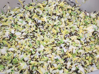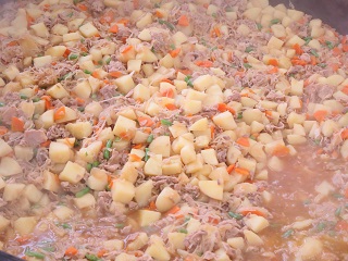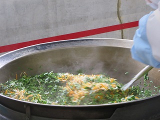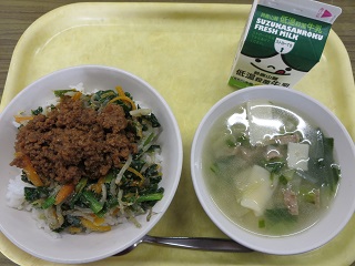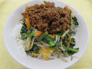 ビビンバは給食の人気メニューです。いくつか種類があり、肉と野菜を和えたものにみそだれをかけて食べるビビンバ、キムチを使ったキムチビビンバ、そして今日のビビンバはみそにひき肉が入った肉みそビビンバです。