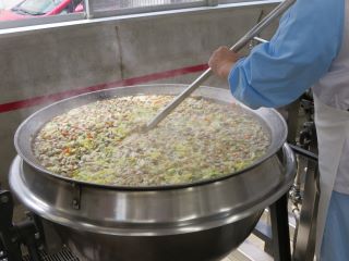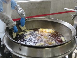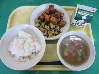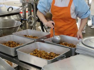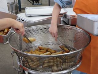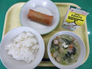 今日の手作り春巻きは、給食室で豚肉、玉ねぎ、まこもたけ、にら、春雨などを炒めた具材を皮で巻き油で揚げて作りました。