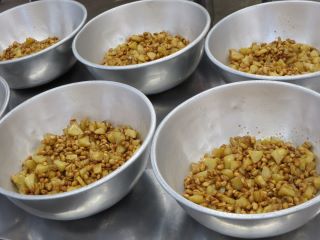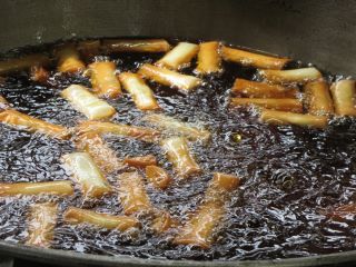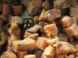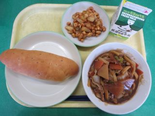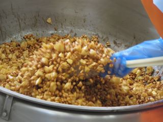 今日は素揚げをしたじゃがいもを入れて、大豆といっしょにたれでからめました。