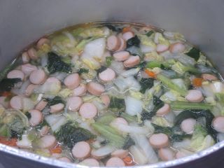ウィンナー、にんじん、玉ねぎ、白菜、小松菜、豆腐が入った中華スープです。