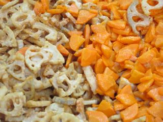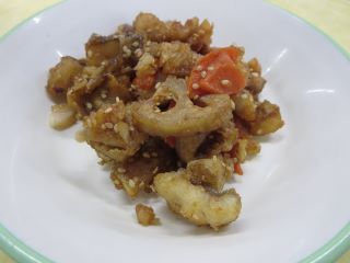 今日はたらとれんこん、にんじんを油で揚げ、甘辛いたれとごまでからめて南部揚げにしました。