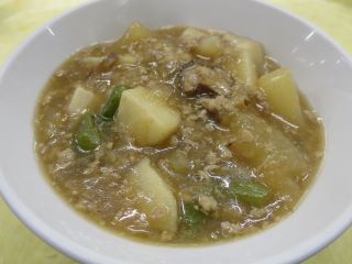 鶏肉、大根、里芋、玉ねぎ、いんげんをじっくり煮込み、最後に片栗粉でとろみをつけました。