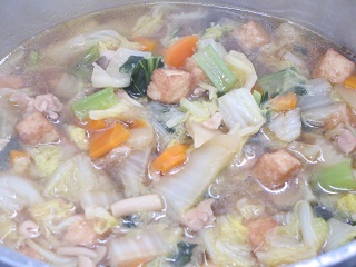 白菜炊きは削節でだしをとり、鶏肉、厚あげ、にんじん、しめじ、白菜、小松菜を入れて煮込みました。
