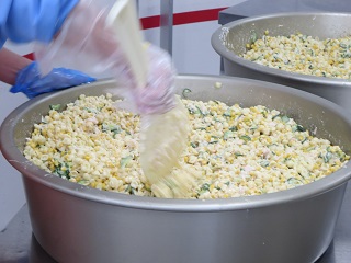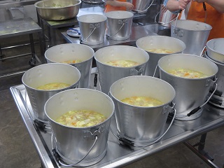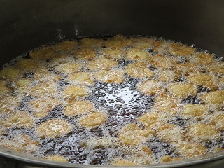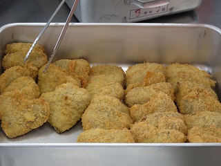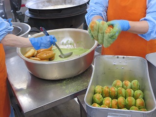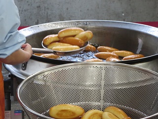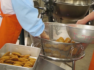 あげパンは給食室で調理員さんが大きな釜でパンを揚げて、細かく粉状にしたお茶の葉と砂糖をまぶして作っています。