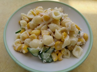マカロニ、ささみ、きゅうり、コーンをドレッシングで和えました。