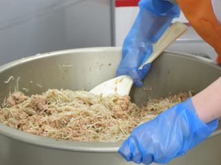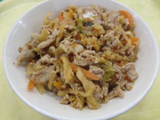 キムタク丼は長野県塩尻市の給食メニューです。長野県は漬物文化が発達している地域です。そこで子どもたちに漬物に親しみをもってほしいという想いから、たくあんとキムチをごはんに混ぜたメニューが考えられました。今回はごはんに混ぜず、ごはんの上にのせる丼にしました。