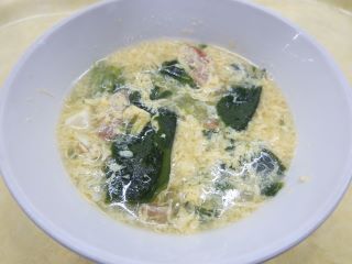 わかめ、ベーコン、豆腐、チンゲン菜、卵が入ったスープです。