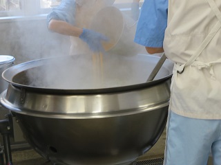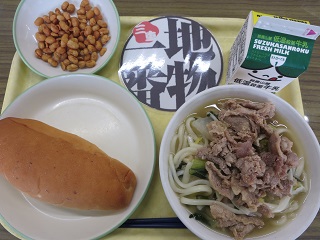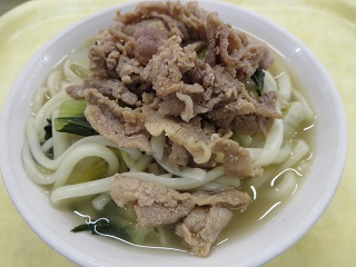 今日の肉うどんはうどんを盛りつけた上に、甘辛く煮た豚肉をのせる形で配膳しました。