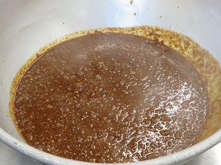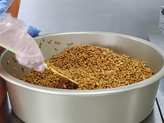 フライビーンズは素揚げした大豆を、さとうとしょうゆで作ったたれでしっかり混ぜ合わせます。