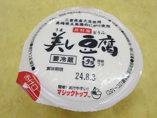 今日の豆腐は容器に入っています。ふたを取って容器からお皿に出し、肉みそと野菜といっしょにいただきました。